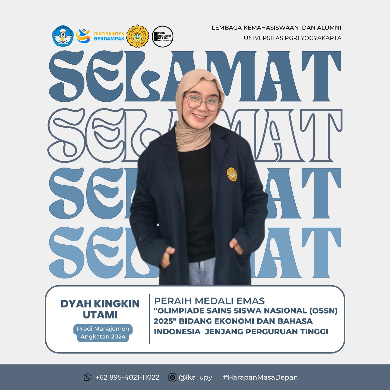 Universitas PGRI Yogyakarta (UPY) kembali mencetak prestasi membanggakan di kancah nasional. Mahasiswi Program Studi Manajemen, Dyah Kingkin Utami, berhasil meraih medali emas dalam ajang Olimpiade Sains Siswa Nasional 2025 (OSSN 2025) untuk kategori Bidang Ekonomi dan Bahasa Indonesia pada jenjang perguruan tinggi.