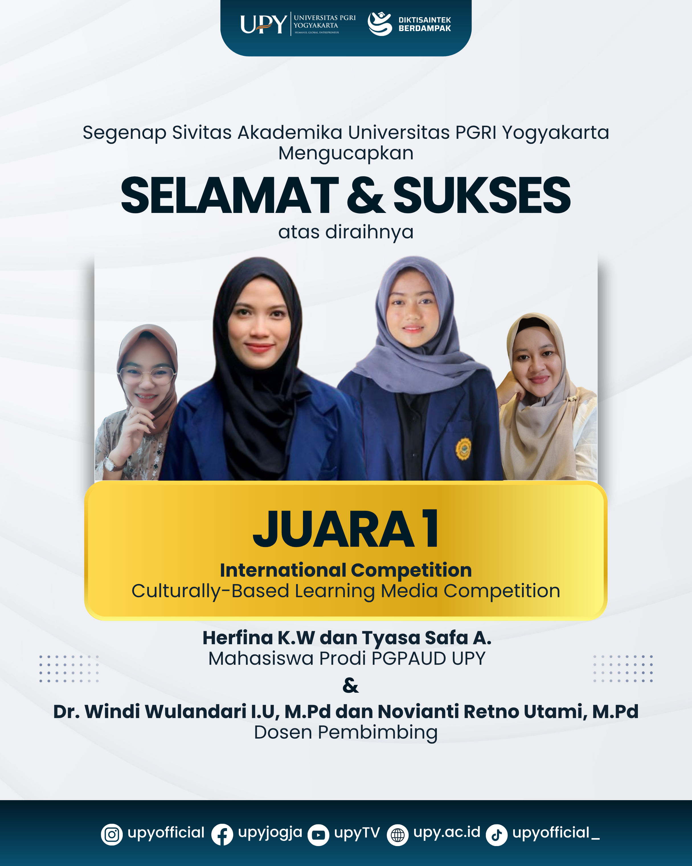 Adalah Herfina K.W dan Tyasa Safa A., dua sosok inspiratif dari PGPAUD UPY yang berhasil meraih Juara 1 dalam ajang “Culturally-Based Learning Media Competition”, sebuah kompetisi internasional yang menantang kreativitas mahasiswa dalam menciptakan media pembelajaran yang berbasis budaya lokal.