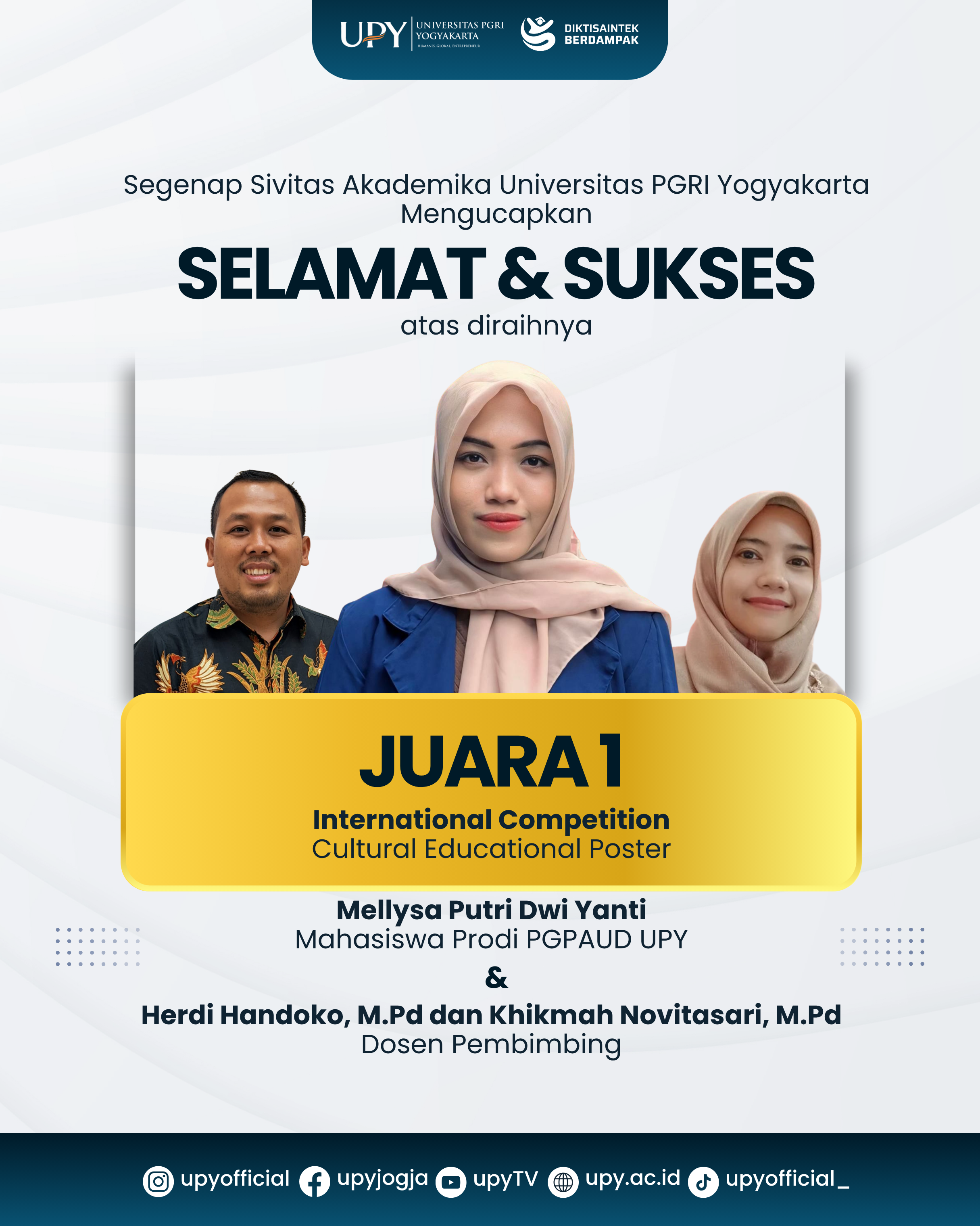 Kabar membanggakan datang dari Universitas PGRI Yogyakarta (UPY). Salah satu mahasiswa Program Studi Pendidikan Guru Pendidikan Anak Usia Dini (PGPAUD), Mellysa Putri Dwi Yanti, berhasil meraih Juara 1 dalam ajang internasional “Cultural Educational Poster”.
