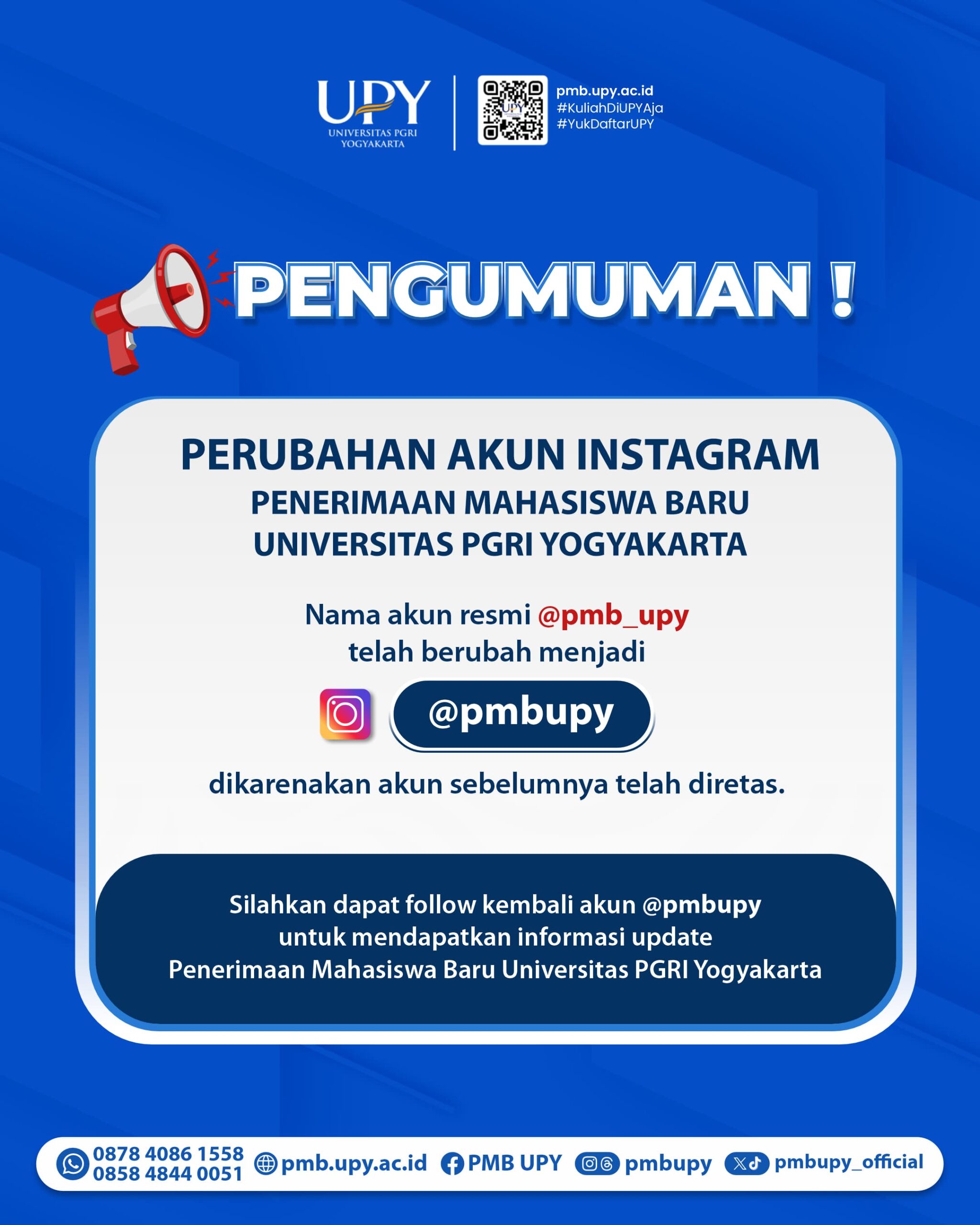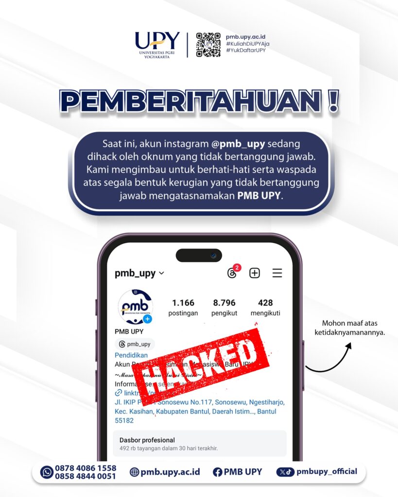 Kami dengan sedih memberitahukan bahwa akun resmi Instagram PMB UPY telah diretas oleh orang yang tidak bertanggung jawab. Kami mengimbau untuk berhati-hati serta waspada atas segala bentuk kerugian yang tidak bertanggung jawab mengatasnamakan PMB Universitas PGRI Yogyakarta.