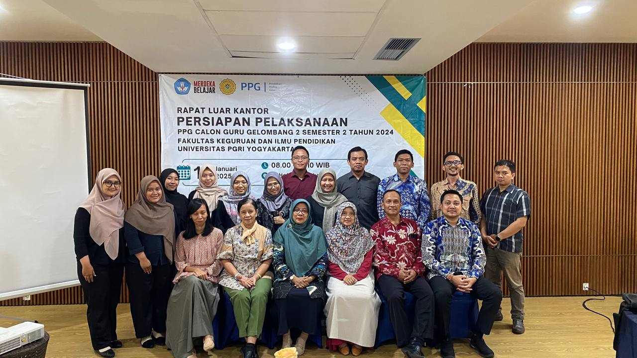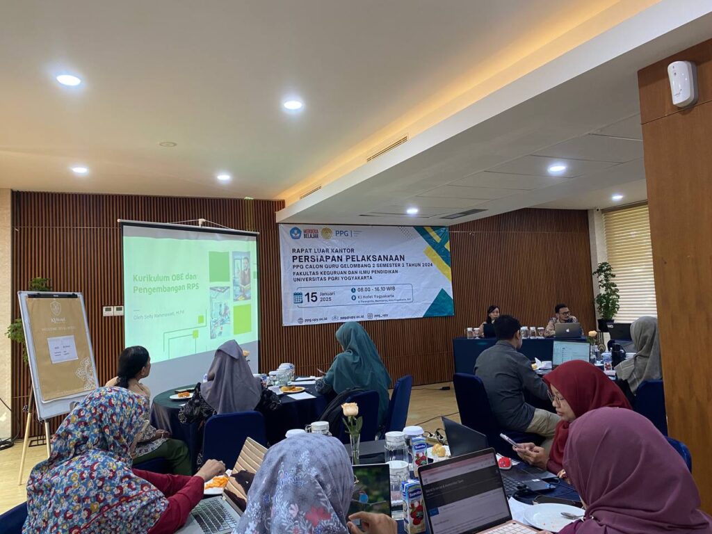 Fakultas Keguruan dan Ilmu Pendidikan (FKIP) Universitas PGRI Yogyakarta (UPY) menggelar rapat luar kantor dalam rangka persiapan pelaksanaan Pendidikan Profesi Guru (PPG) bagi calon guru Gelombang 2 Semester 2 Tahun 2024. Kegiatan ini berlangsung pada hari Senin, 5 Februari 2024, bertempat di KJ Hotel Yogyakarta, Jl. Parangtritis, Mantrijeron, Kota Yogyakarta. Rapat ini diadakan dari pukul 08.00 hingga 16.10 WIB dan dihadiri oleh jajaran pimpinan fakultas, dosen, serta tenaga kependidikan yang terlibat dalam program PPG.