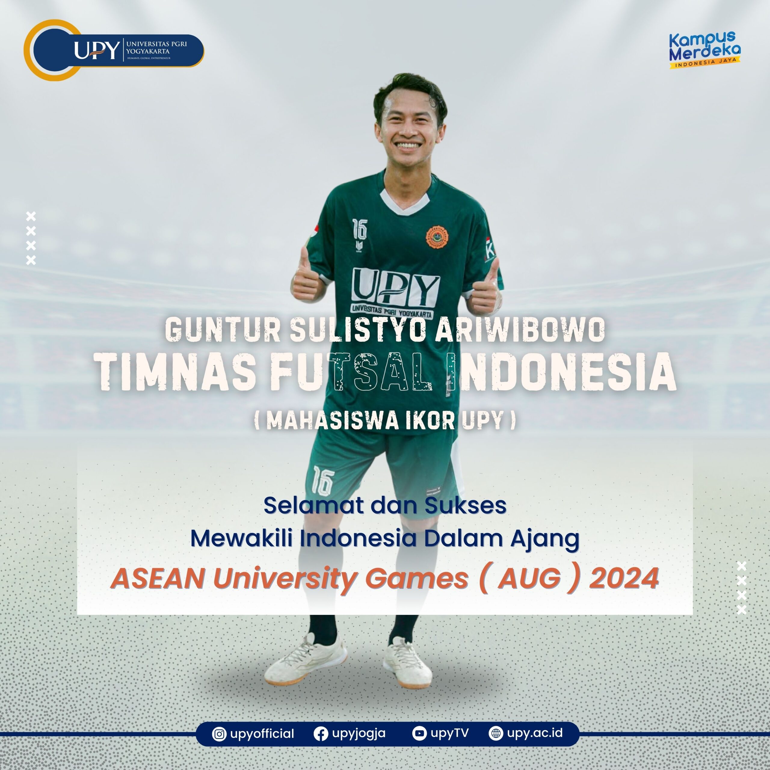 Selamat dan Sukses Guntur Sulistyo Ariwibowo (Mahasiswa IKOR UPY) yang tergabung di Timnas Futsal Indonesia dalam ASEAN University Games (AUG) 2024.