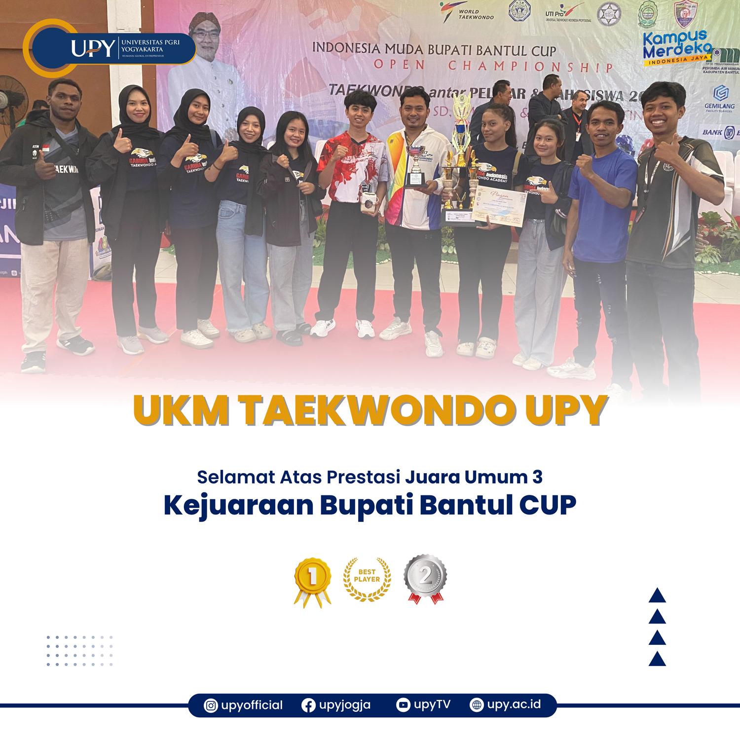 UKM Taekwondo UPY Berjaya di kejuaraan Bupati Bantul CUP dengan perolehan 2 medali emas dan 5 medali perak dan 1 best player dengan hasil tersebut UPY bisa masuk juara umum 3.