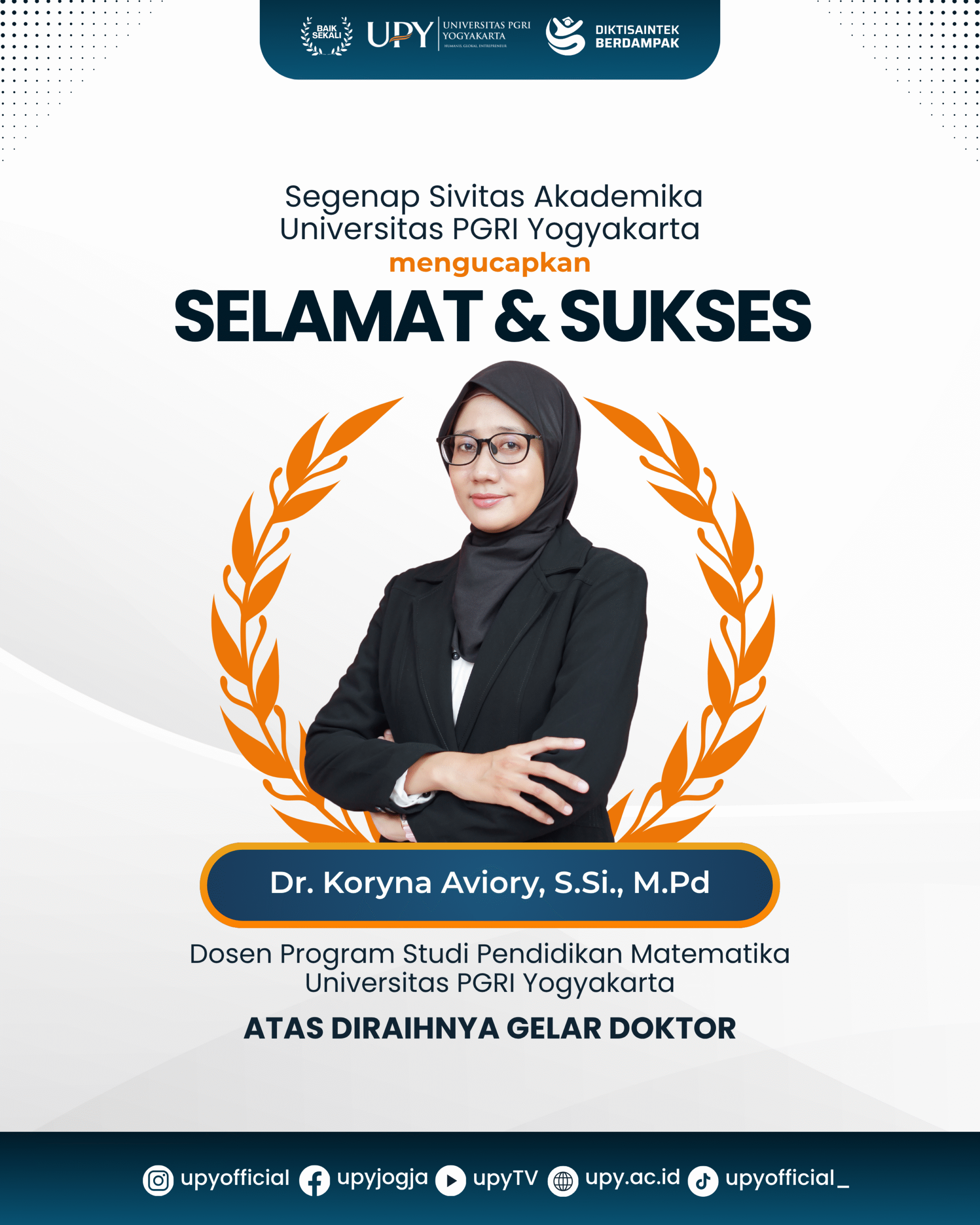 Kabar menggembirakan datang dari Program Studi Pendidikan Matematika. Dr. Koryna Aviory, S.Si., M.Pd., resmi menyandang gelar doktor setelah menyelesaikan studi doktoralnya. Keberhasilan ini disambut antusias oleh sivitas akademika UPY, yang melihat capaian ini sebagai momentum penting dalam mendorong kualitas tridarma perguruan tinggi pengajaran, penelitian, dan pengabdian kepada masyarakat.