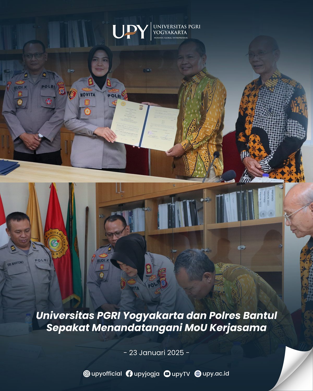 Universitas PGRI Yogyakarta (UPY) dan Polres Bantul resmi menandatangani Memorandum of Understanding (MoU) sebagai langkah strategis dalam meningkatkan kerja sama di bidang pendidikan, penelitian, serta pengabdian kepada masyarakat.