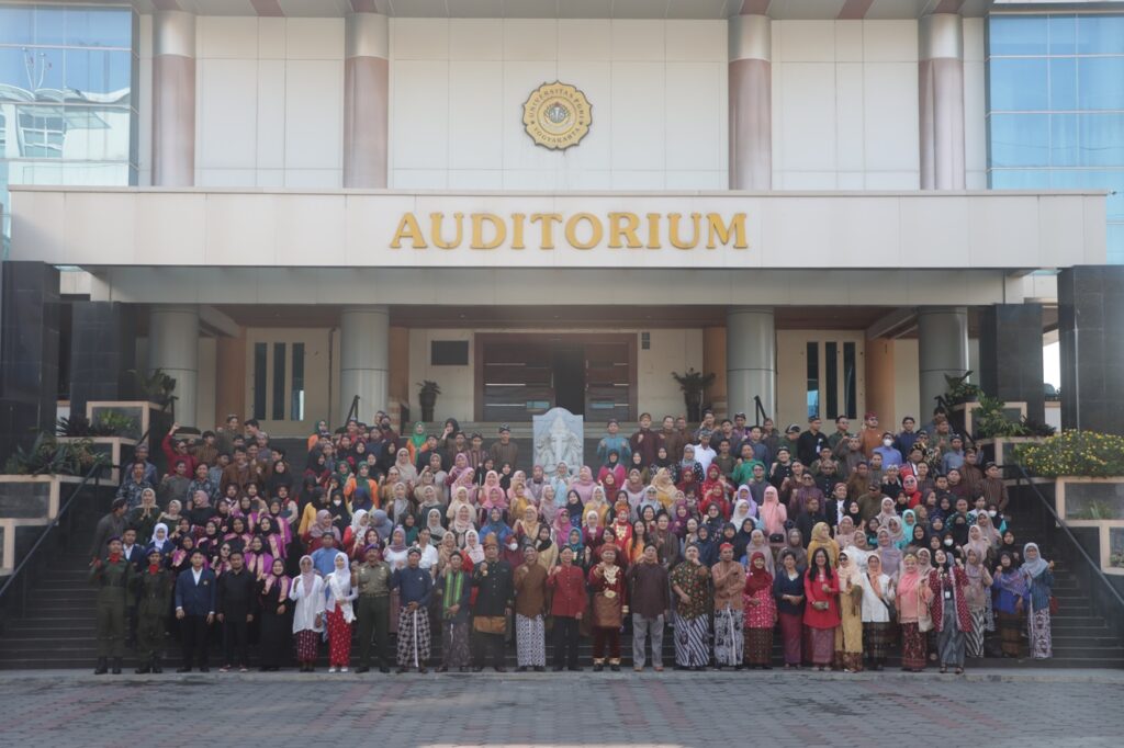 Di akhir rangkaian Upacara HUT ke-79 RI, semua peserta upacara berfoto bersama dengan pimpinan di depan Auditorium Unit 1 UPY.