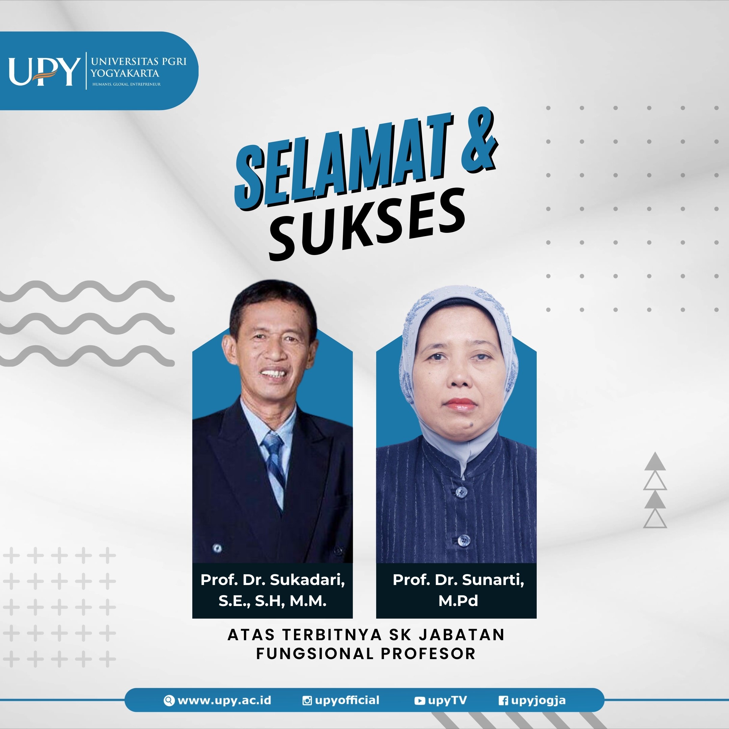 Selamat & Sukses Bapak Prof. Dr. Sukadari, S.E., S.H., M.M. atas terbitnya SK Profesor/Guru Besar dalam bidang Ilmu Pendidikan serta Ibu Prof. Dr. Sunarti, M.Pd atas terbitnya SK Profesor/Guru Besar dalam bidang Ilmu Pendidikan Bahasa Indonesia.