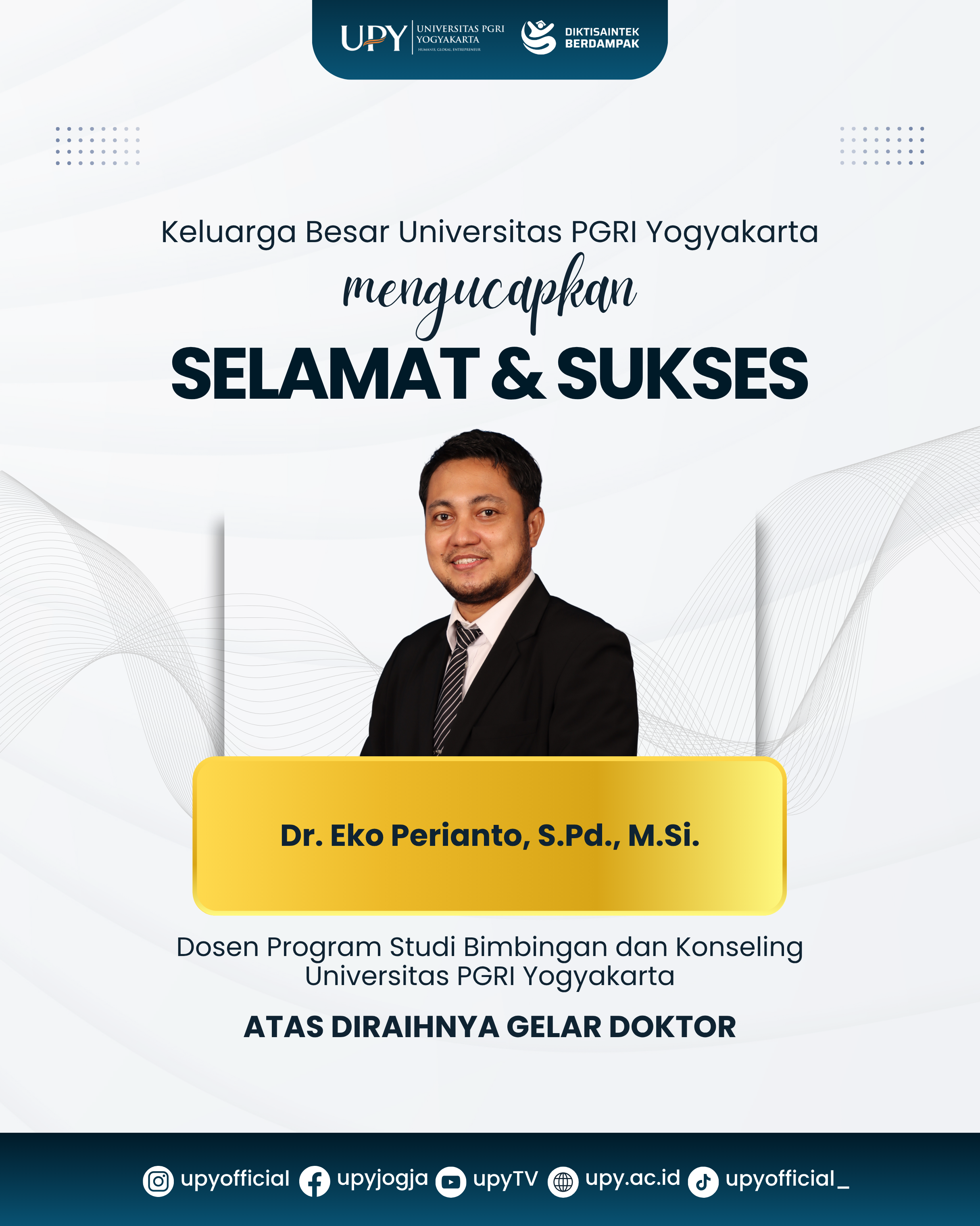 Universitas PGRI Yogyakarta (UPY) kembali menunjukkan komitmennya dalam meningkatkan kualitas pendidikan tinggi. Salah satu langkah nyata yang diambil adalah menambah jumlah dosen bergelar doktor di berbagai program studi. Kabar baik kali ini datang dari Program Studi Bimbingan dan Konseling, dengan keberhasilan Dr. Eko Perianto, S.Pd., M.Si. menyelesaikan studi jenjang S-3.